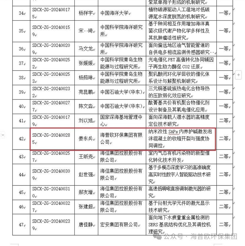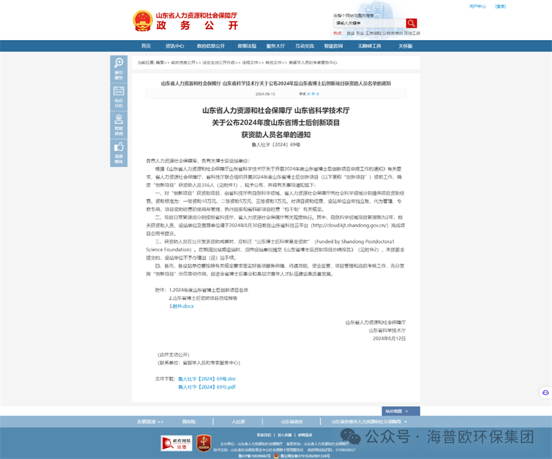 2024 年 8 月,諸城人社廳傳來令人振奮的消息。山東省人社廳與科技廳聯(lián)合公布年度博士后創(chuàng)新項(xiàng)目獲資助人員名單,海普歐環(huán)保集團(tuán)有限公司的姜東兵博士后榮耀在列。