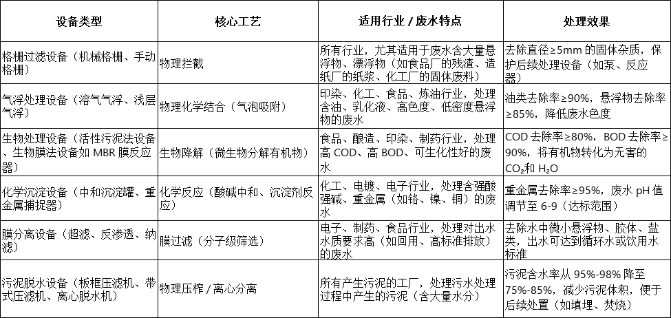 不同行業(yè)的工廠廢水成分差異極大(如化工廢水含強(qiáng)酸強(qiáng)堿、重金屬,印染廢水含高色度、難降解有機(jī)物,食品廢水含高 COD、高懸浮物),對(duì)應(yīng)的污水處理設(shè)備也需 “對(duì)癥下藥”。以下是常見設(shè)備類型及適用場(chǎng)景: