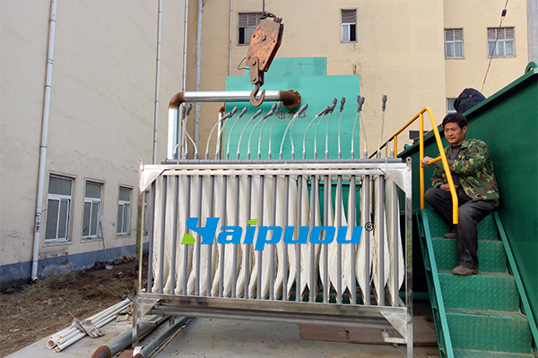 風(fēng)機(jī)停止運(yùn)轉(zhuǎn)超過1天尤其是夏天,可導(dǎo)致微生物大量死亡。如果系統(tǒng)停止運(yùn)轉(zhuǎn)1-3天后重新運(yùn)轉(zhuǎn),應(yīng)在風(fēng)機(jī)運(yùn)轉(zhuǎn)1天后恢復(fù)活性污泥活性再使系統(tǒng)處于自動控制狀態(tài)、自動運(yùn)行水泵出水。如果系統(tǒng)長時(shí)間停止運(yùn)轉(zhuǎn)(超過3天)后再重新運(yùn)轉(zhuǎn),須參照說明書第六-1節(jié)MBR調(diào)式種的微生物尋花培養(yǎng)過程進(jìn)化。