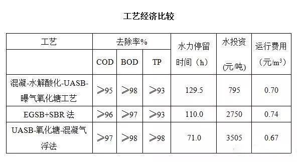 目前國(guó)內(nèi)常用的工藝有混凝-水解酸化-UASB-曝氣氧化塘工藝、EGSB+SBR法、UASB-氧化塘-混凝氣浮法等,這些工藝處理淀粉廢水效率高,均能使處理后的水達(dá)到國(guó)家排放標(biāo)準(zhǔn),其工藝技術(shù)經(jīng)濟(jì)比較詳見(jiàn)下表。