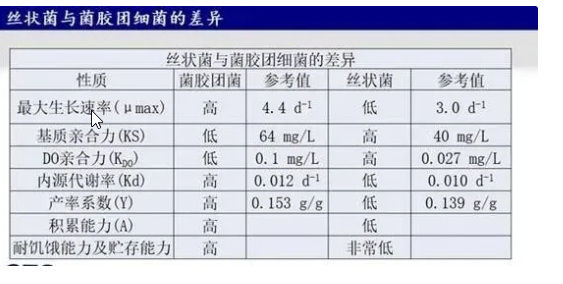 活性污泥是一種混合培養(yǎng)系統(tǒng),其中至少有30種絲狀菌可能導(dǎo)致污泥膨脹。絲狀菌和膠束菌平衡生長不會出現(xiàn)污泥膨脹的問題,只有絲狀菌比膠束菌生長多才會出現(xiàn)污泥膨脹。絲狀菌和膠束菌的生理生化特性差異如下表所示。