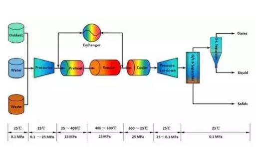 SCWO以超臨界水為介質(zhì),均相氧化分解有機(jī)物。有機(jī)污染物可在短時間內(nèi)分解成無機(jī)小分子,如CO2、H2O,硫、磷和氮分別轉(zhuǎn)化為硫酸鹽、磷酸鹽、硝酸根和亞硝酸根離子或氮。美國將SCWO法列為能源和環(huán)境領(lǐng)域最有前途的廢物處理技術(shù)。